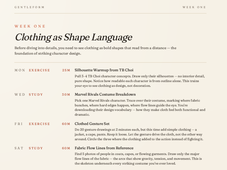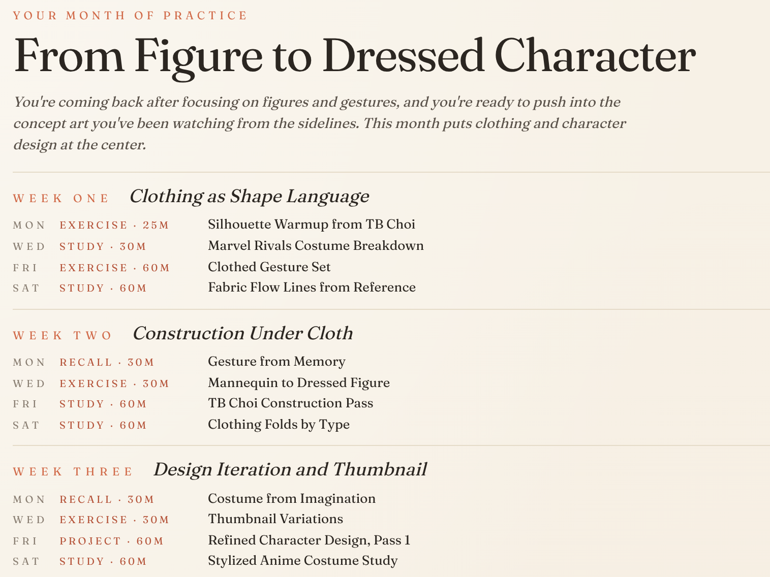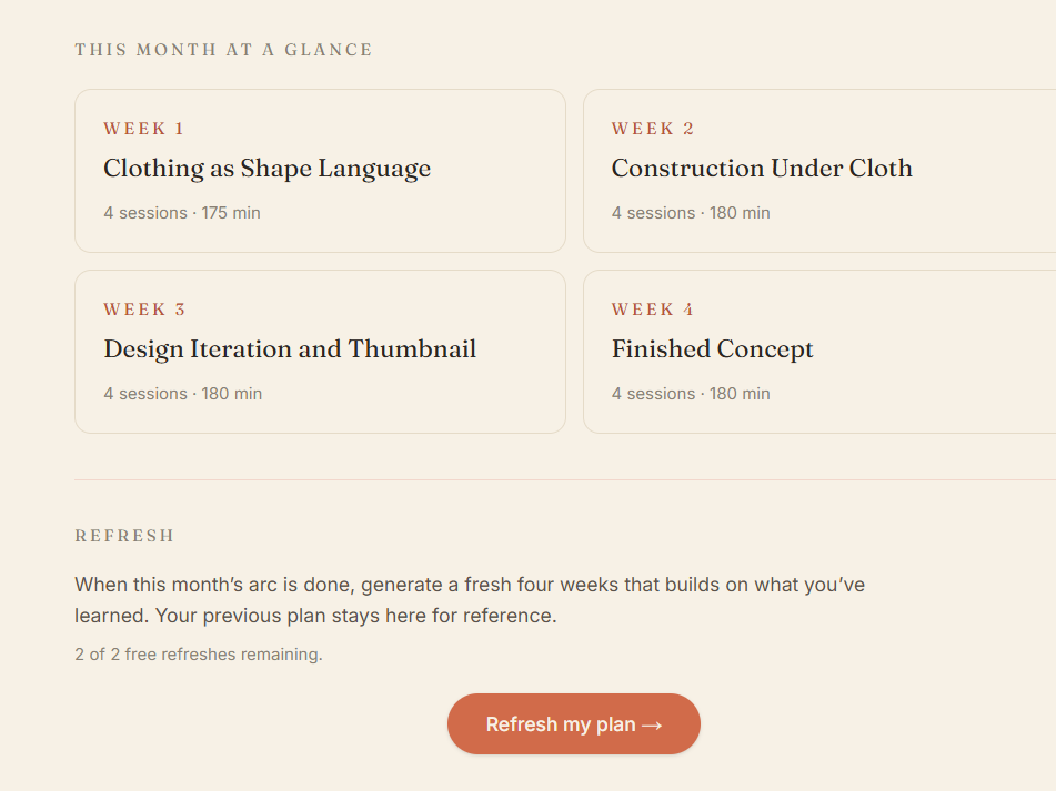 Most art-practice planners are static templates with empty schedule grids. This one is generated for you the moment you finish the questionnaire — your subject, your level, your schedule, the artists you named, the weakness you wrote down. Every session, every reference, every piece of advice is written for the answers you gave.